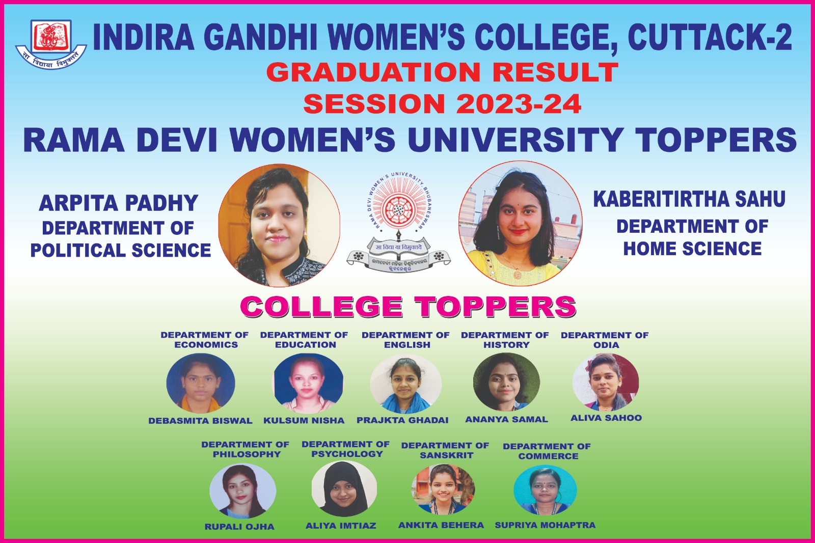 The Indira Gandhi Women’s College, a leading institution of higher education in Humanities at both +2 & degree (Pass & Hons.) level and in Science at +2 level, got established in the year 1980, on the south-western fringe of the Silver City Cuttack, has been consistently diffusing Women’s education and Culture